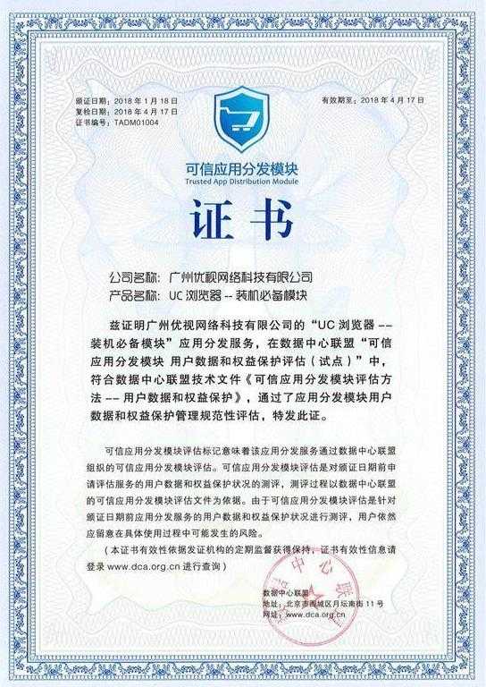 1月18日,工信部指导成立的数据中心联盟发布了“可信应用分发模块评估(试点)”结果,经过严格的材料审查、技术测试和专家评审,广州优视网络科技有限公司的“UC浏览器–装机必备模块”成为首批通过评估的产品之一。